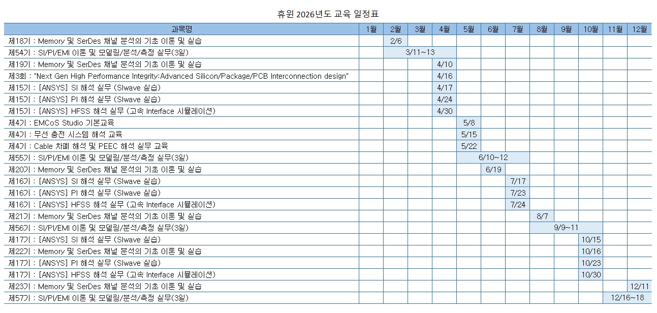 • SI/PI/EMI 이론 및 모델링/분석/측정 실무(3일), SI/PI 해석 실무(SIwave 실습:1일), HFSS 해석 실무(고속 Interface 시뮬레이션:1일)